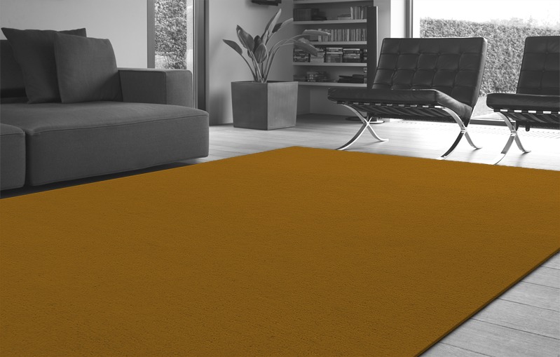 This hand-tufted pure wool plain rug in burnt maize yellow is hand made to measure by rug couture.